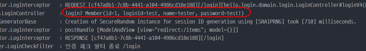 LogInterceptor에서 인증 사용자로 판단되어 로그인 정보가 나온 후 세션 ID가 생성된 것을 볼 수 있다.