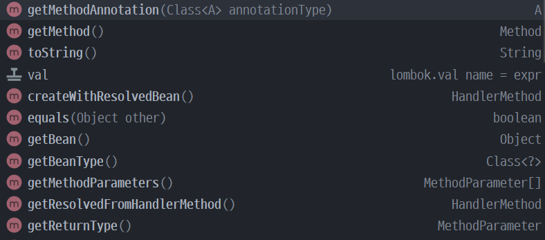 위 코드에서는 핸들러 매핑 정보를 매핑한 후 별도 로직이 없지만, HandlerMethod를 얻은 후, 아래와 같은 다양한 기능들을 지원한다.