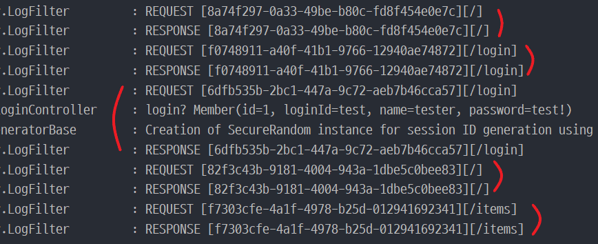 각 컨트롤러마다 LogFilter가 동작했음을 알 수 있다. 테스트 흐름은 다음과 같다.