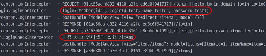 ModelAndView의 내용을 보면 로그인 직전 페이지였던 상품 관리 페이지(/items)로 잘 리다이렉트 된 것을 확인할 수 있다. 또한, 로그인 후에 상품 관리 페이지로 리다이렉트 될 때 컨트롤러가 호출된 것이므로, 여기서도 LoginCheckInterceptor가 동작하여 인증 체크를 수행하는 것을 볼 수 있다.