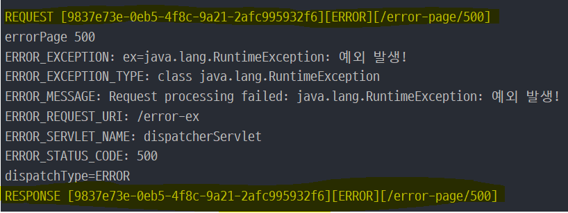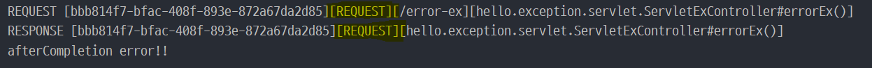 위 결과를 보면 필터 때와는 달리 오류 정보 출력 부분에 로그가 찍혀 있지 않다. 반면, 처음 "/error-ex"를 요청했던 클라이언트의 요청(REQUEST)은 로그가 찍혀 있다. 이처럼 excludePathPatterns를 통해 오류 페이지에 대해서는 인터셉터가 동작하지 않은 것을 알 수 있다.