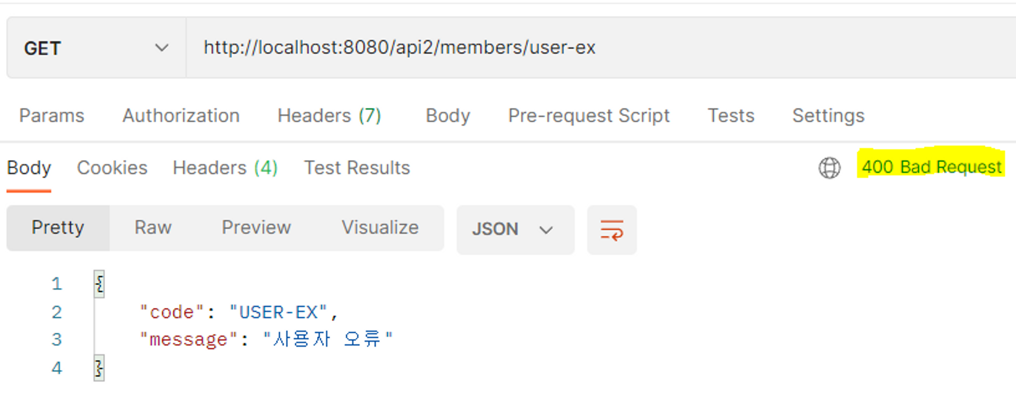 - @ResponseStatus(HttpStatus.BAD_REQUEST)를 지정했으므로, HTTP 상태 코드 400으로 응답한다.