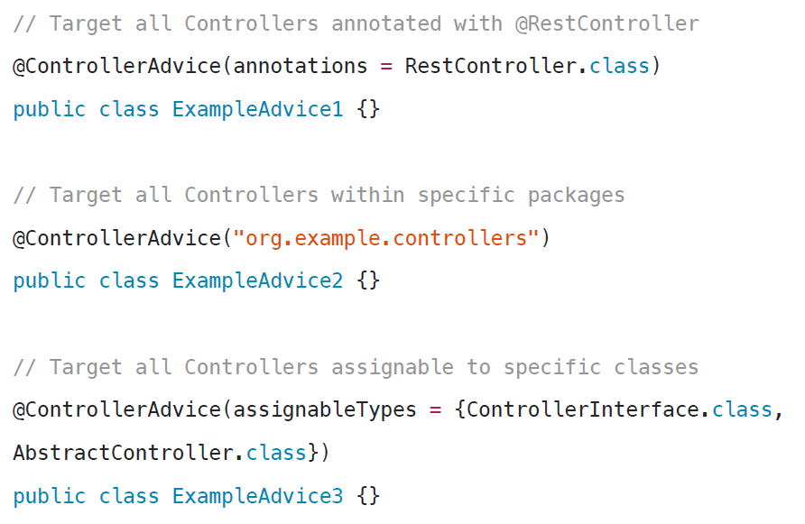 - @ControllerAdvice와 함께 사용하면 예외 처리 코드를 분리하고, 컨트롤러마다 예외를 적용할 수 있다.