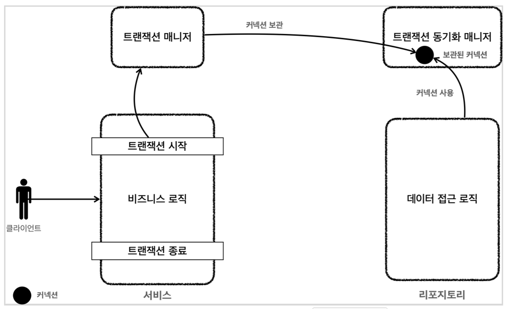 트랜잭션 매니저는 내부에서 트랜잭션 동기화 매니저(TransactionSynchronizationManager)를 사용한다. 트랜잭션 동기화 매니저는 ThreadLocal을 통해 커넥션을 동기화하는데, 쓰레드마다 별도의 저장소가 부여되고 해당 스레드만 데이터에 접근이 가능하다. 또한, 멀티스레드 환경에서도 안전하게 커넥션을 동기화할 수 있다.