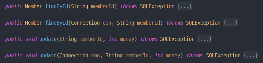 데이터베이스에 접근하는 메서드마다 메서드 오버로딩을 거쳐야 하므로 코드 낭비가 많아지고 유지보수성도 떨어진다. 또한, 트랜잭션을 유지하지 않아도 되는 기능이 있다면 다시 한번 분리해야 하는 번거로움이 있다.