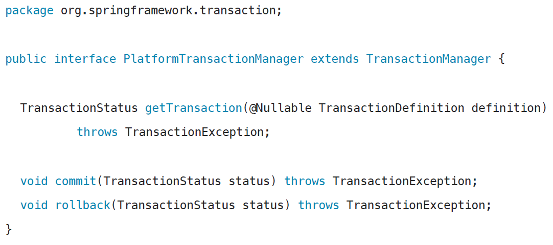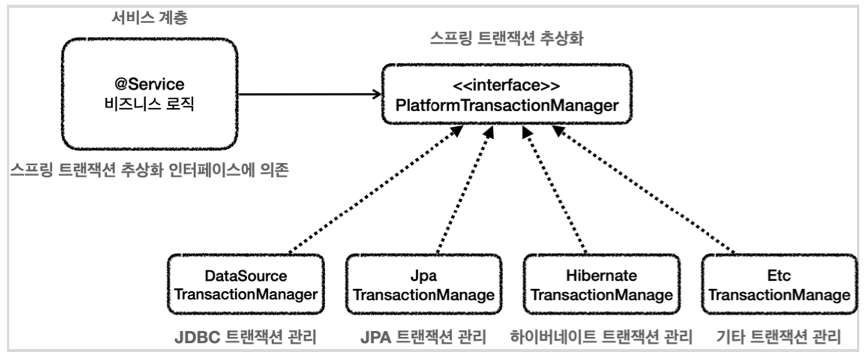 스프링은 트랜잭션의 주요 기능을 추상화한 PlatformTransactionManager 인터페이스(extends TransactionManager)를 제공한다.