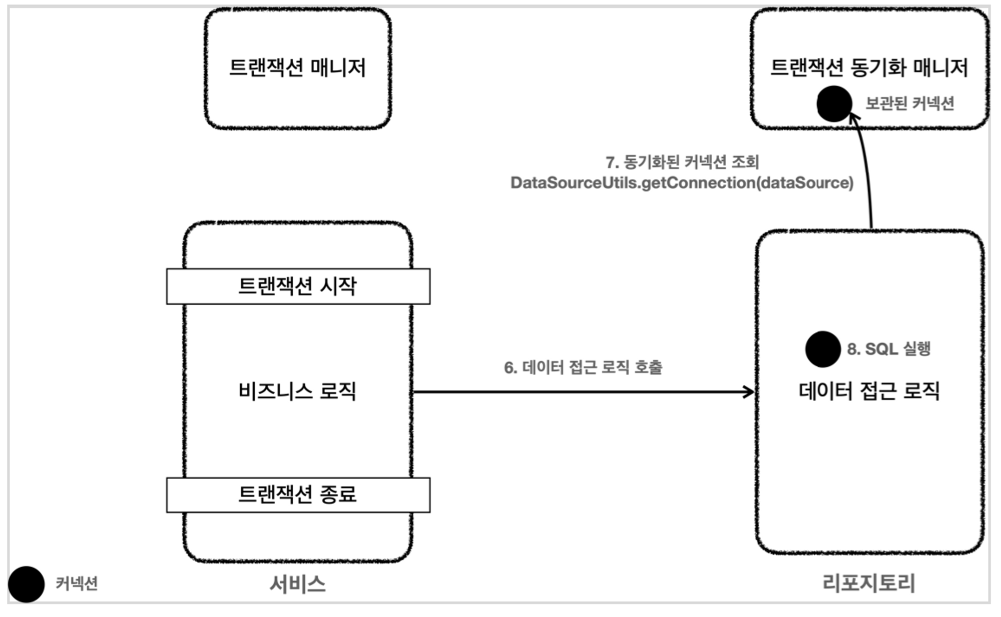 4. Repository(데이터 접근 계층)는 트랜잭션 동기화 매니저에 보관된 커넥션을 꺼내서 사용