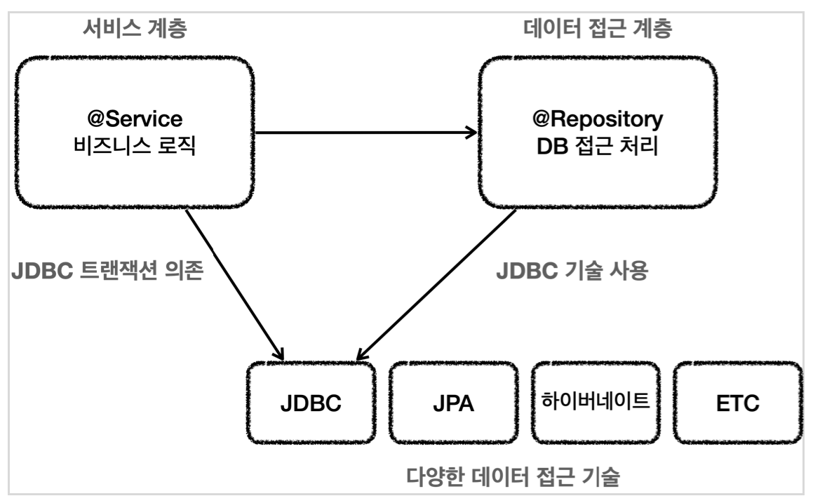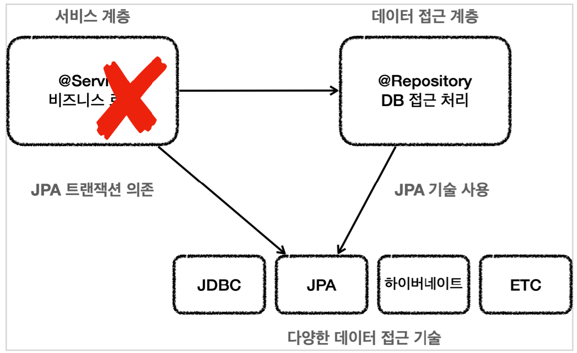 하지만, 서비스 계층에서 트랜잭션 관련 로직인 트랜잭션 획득, 커밋, 롤백 등을 포함하면 순수 Java 로직과 데이터 접근 로직이 섞여 유지보수나 테스트에 불리하다. 그리고 가장 큰 문제는 데이터 접근 기술을 교체할 수 없다는 것이다. 그 이유는 서비스 계층에서 구체적인 접근 기술에 의존하기 때문이다.