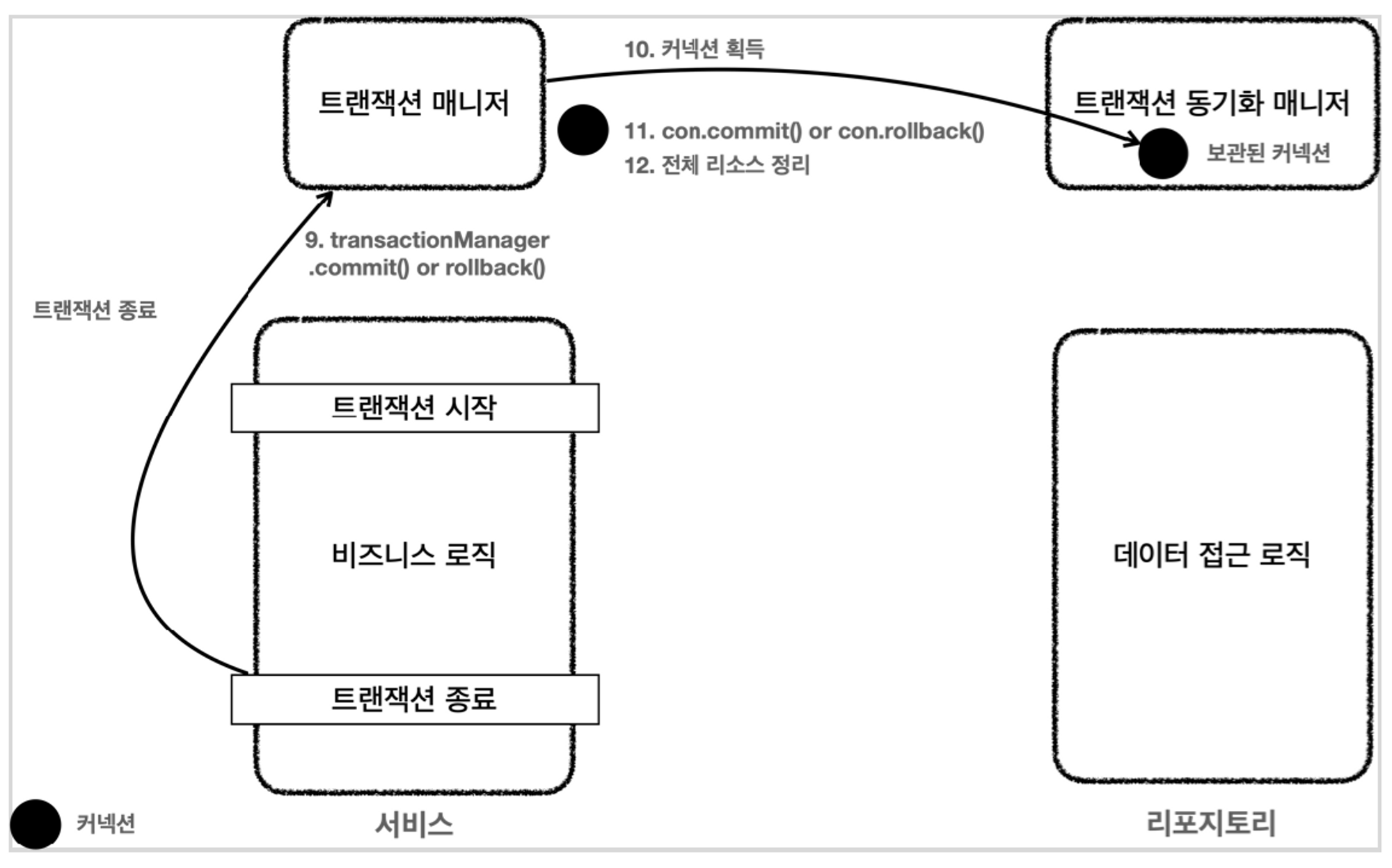 5. 트랜잭션이 종료되면, TransactionManager는 트랜잭션 동기화 매니저에 보관된 커넥션을 통해 트랜잭션을 종료하고 커넥션도 닫는다.