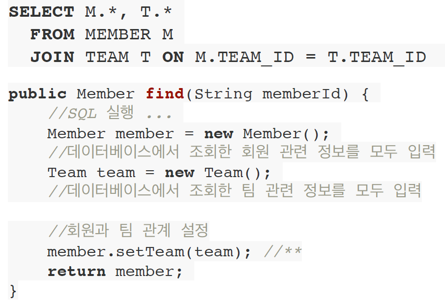 - 테이블은 외래키를 사용하여 연관 관계 객체에 접근 ➡ FROM A a JOIN B b ON A.id = B.id