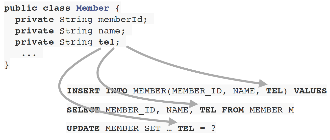 하지만 JPA는 코드에 필드 하나만 추가하면 SQL은 JPA가 처리한다.