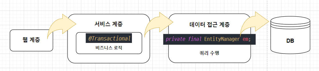 일반적으로 Service 계층에서 @Transactional 을 통해 트랜잭션을 열고 비즈니스 로직 등을 수행한 후 데이터 접근 계층에서