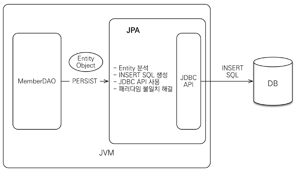 그리고 아래와 같이 EntityManager를 통해 persist()를 하면 위 그림처럼 Entity 분석부터 패러다임 불일치까지 해결해 준다.
