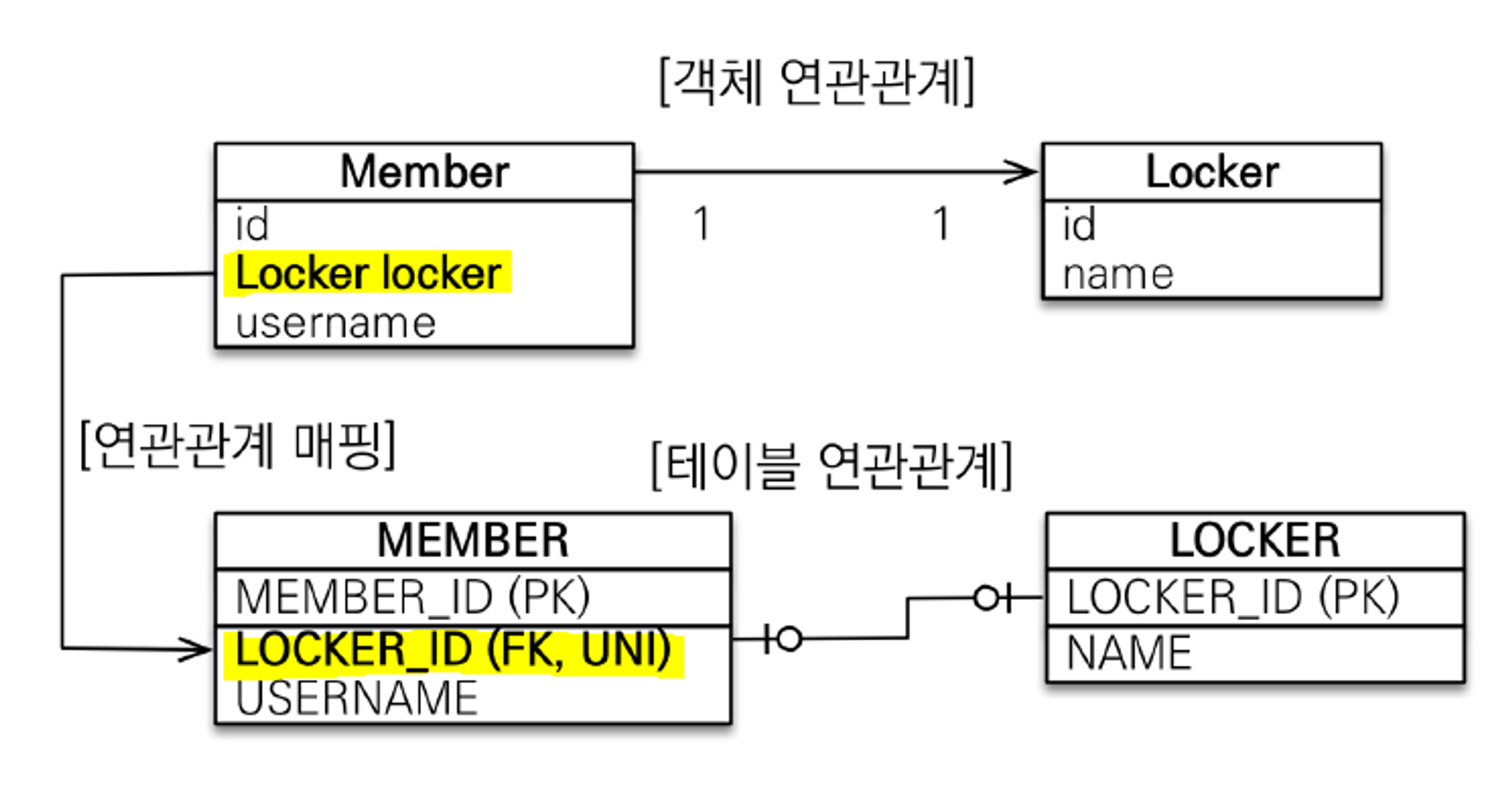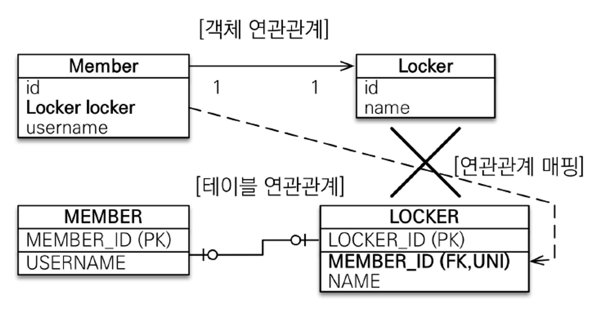 입력해야 한다는 것을 인지한다. 반면, 대상 테이블인 Locker에 외래키가 있다면 Member에서 Locker의 데이터 유무를 판단할 수 없다. 즉, 사물함을 배치받은