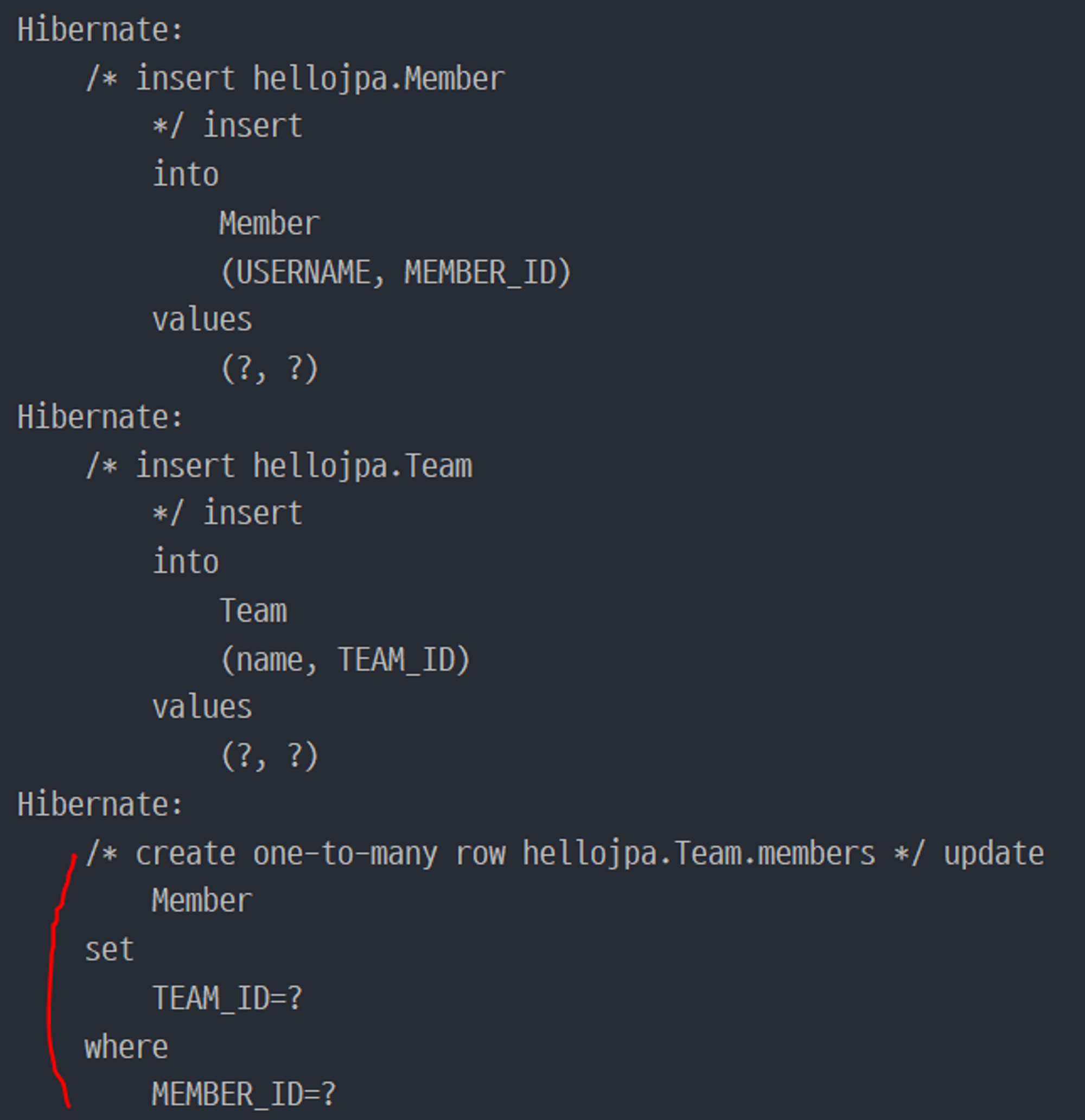 위 결과를 보면 Team 쪽에서 작업을 했는데 Member에서도 변경이 발생한 것을 알 수 있다. 왜냐하면 Team에서 Member의 외래키에 접근할 방법이 없어