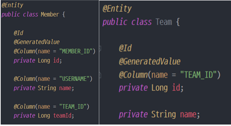 참조값을 어디에 둘지는 비즈니스 로직에 따르면 된다. 예를 들어, 회원과 팀이 있고 두 엔티티가 연관 관계를 맺고 싶다고 하자. 이때, 회원에서 getTeam()이 필요하다면 회원에 참조값이 있어야 하고 회원 엔티티에서 팀 엔티티로 접근할 수 있다.