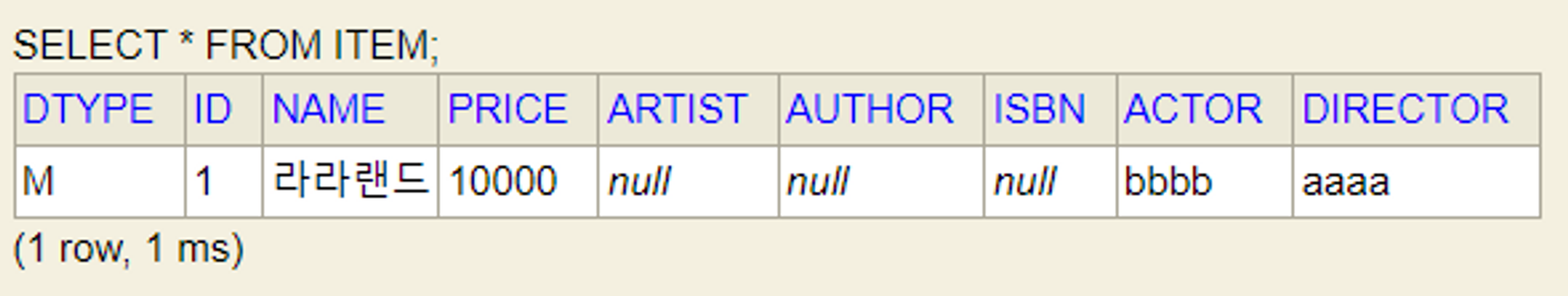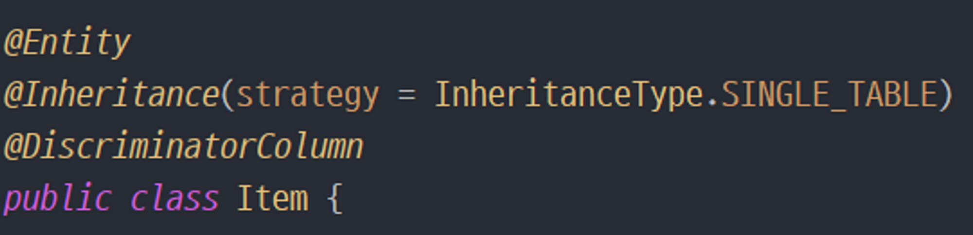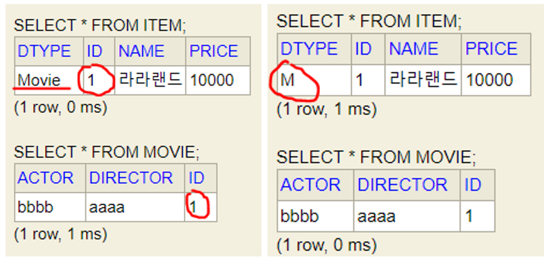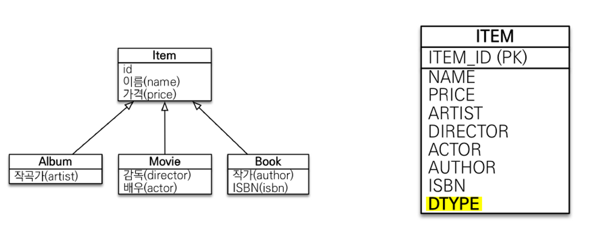 - 서브타입을 구분하는 컬럼(DTYPE)을 슈퍼타입이 가짐