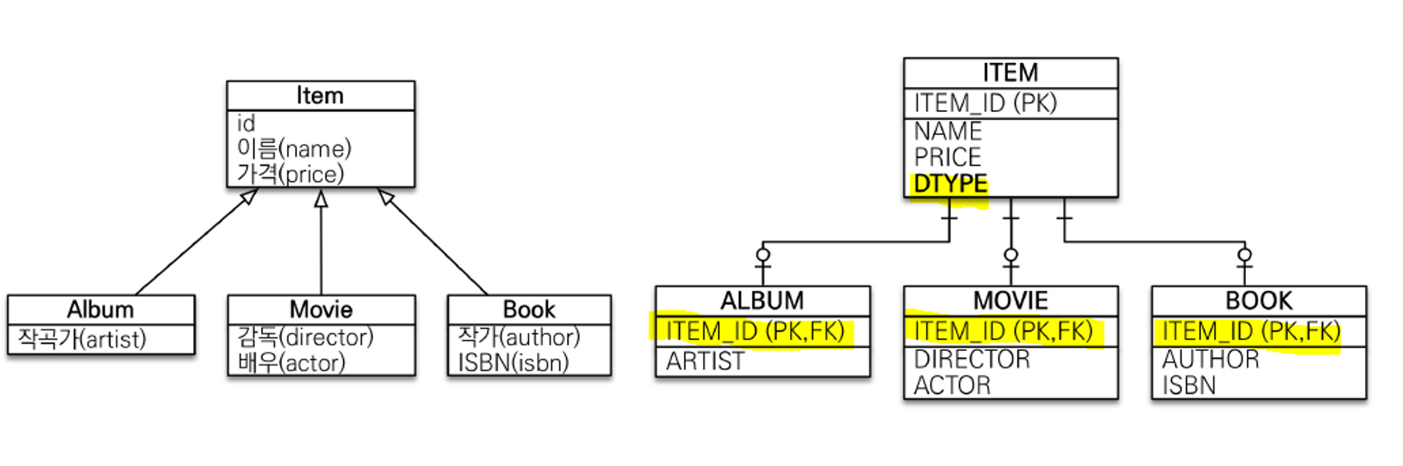 - 서브타입을 구분하는 컬럼(DTYPE)을 슈퍼타입이 가짐
