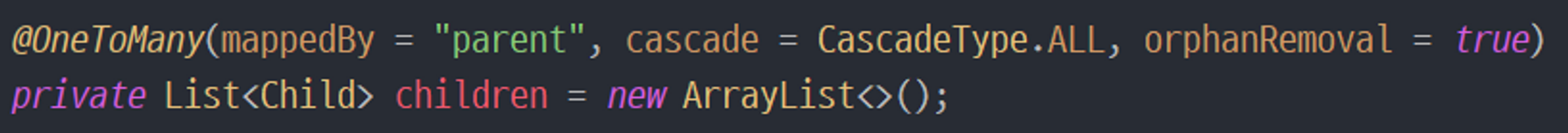 - orphanRemoval = true ➡ 연쇄 삭제 + Collection에서 빠진 요소를 자동 삭제 (2가지 상황에 대해 자동 삭제)