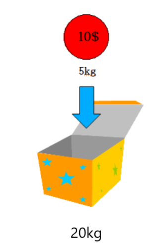 빈 상자에 20kg을 담을 수 있다. 해당 무게만큼 담을 때, 담은 공의 가격이 가장 높은 케이스를 찾는 것이다. 즉, 특정 조건 내에서 가장 가치합이 높은 조합을 찾는 것이다.