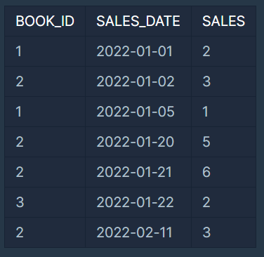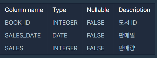 BOOK_SALES 테이블은 각 도서의 날짜 별 판매량 정보를 담은 테이블로 아래와 같은 구조로 되어있습니다.