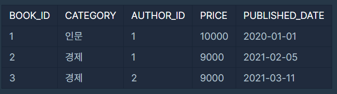 BOOK 테이블은 각 도서의 정보를 담은 테이블로 아래와 같은 구조로 되어있습니다.