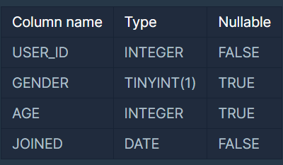 다음은 어느 의류 쇼핑몰에 가입한 회원 정보를 담은 USER_INFO 테이블과 온라인 상품 판매 정보를 담은 ONLINE_SALE 테이블 입니다.USER_INFO 테이블은 아래와 같은 구조로 되어있으며 USER_ID, GENDER, AGE, JOINED는 각각 회원 ID, 성별, 나이, 가입일을 나타냅니다.