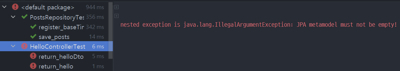 @EnableJpaAuditing가 @SpringBootApplication와 함께 있다 보니 @WebMvcTest에서도 스캔하게 되었다. 그래서 @EnableJpaAuditing과 @SpringBootApplication 둘을 분리하도록 하겠다.