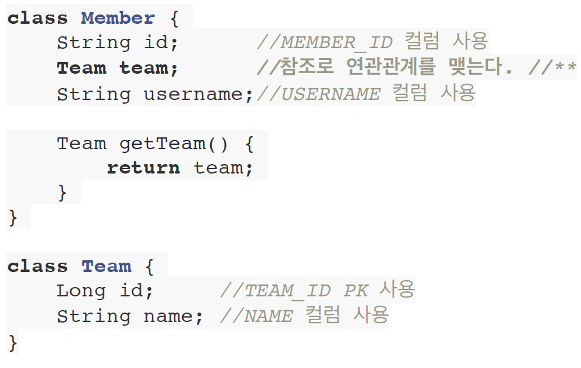 - 객체는 참조 값을 통해 연관 관계 객체에 접근 ➡ member.getTeam()